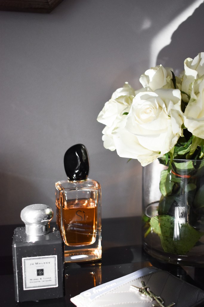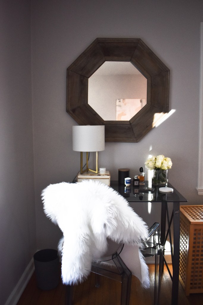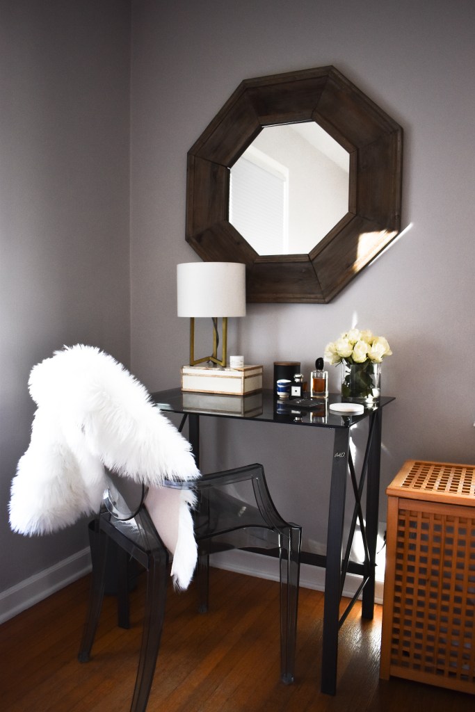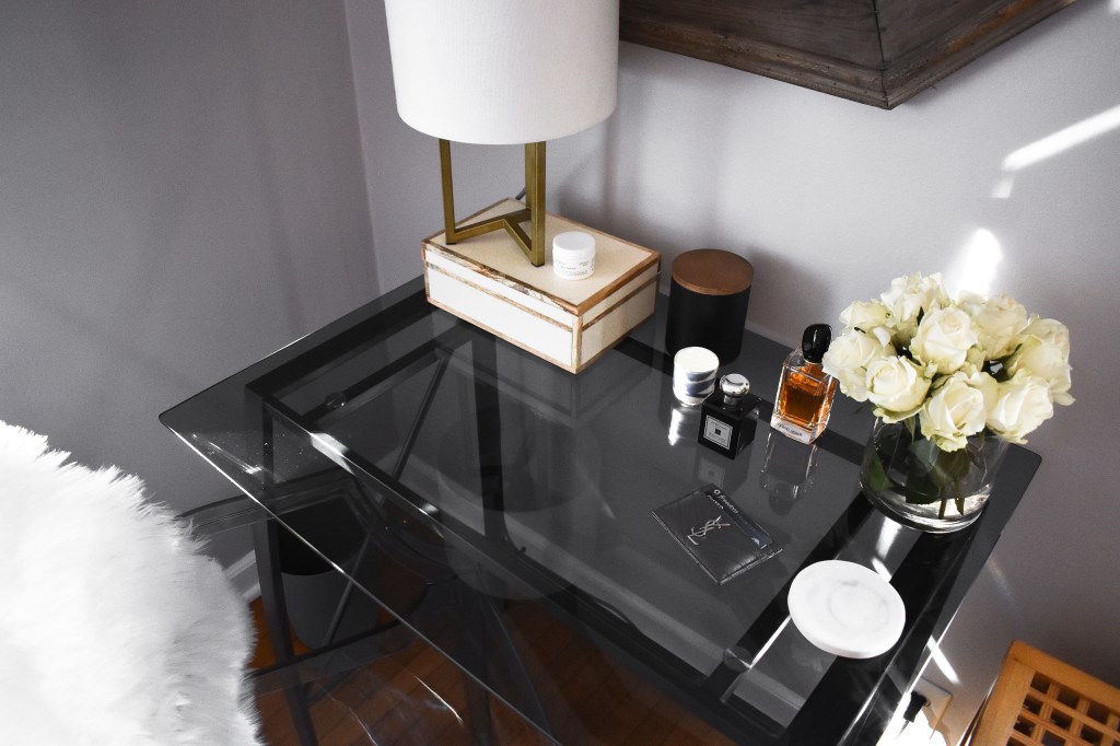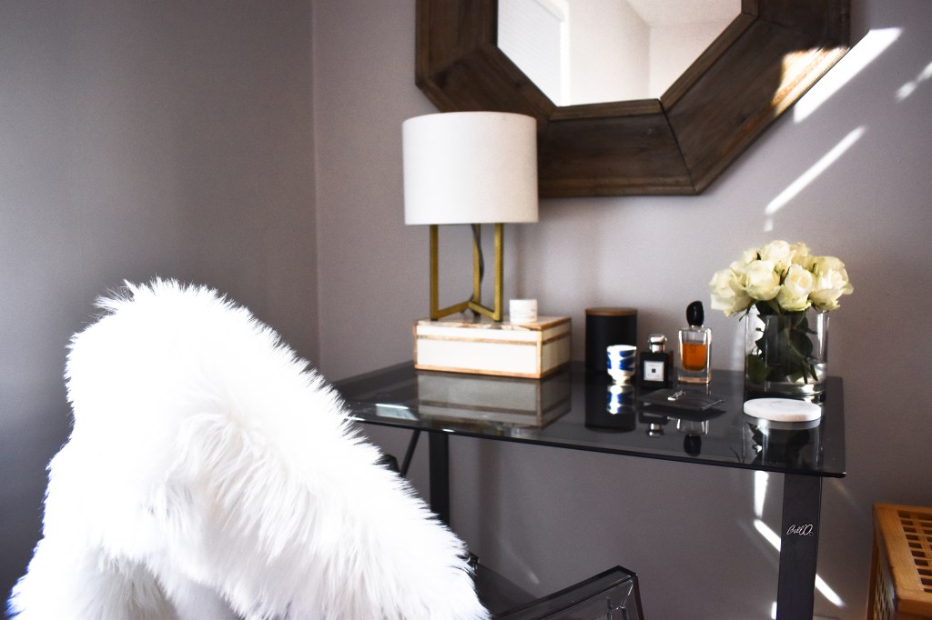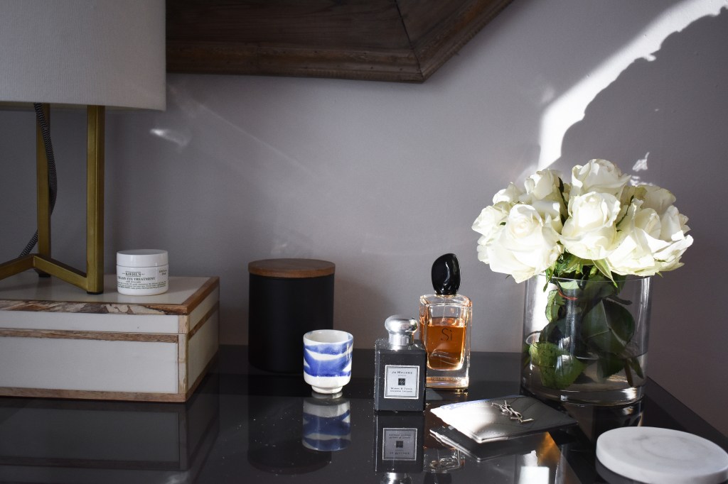 Here’s a closer look at some of my favorite details. I love to display my pretty perfume bottles (both for convenience and aesthetic reasons). Once I grow my perfume collection, I’d love to buy a marble tray to display them all on my dresser. I have a helpful blog post where I talk about all my favorite decorative trays if you’d like to see more of my picks.
