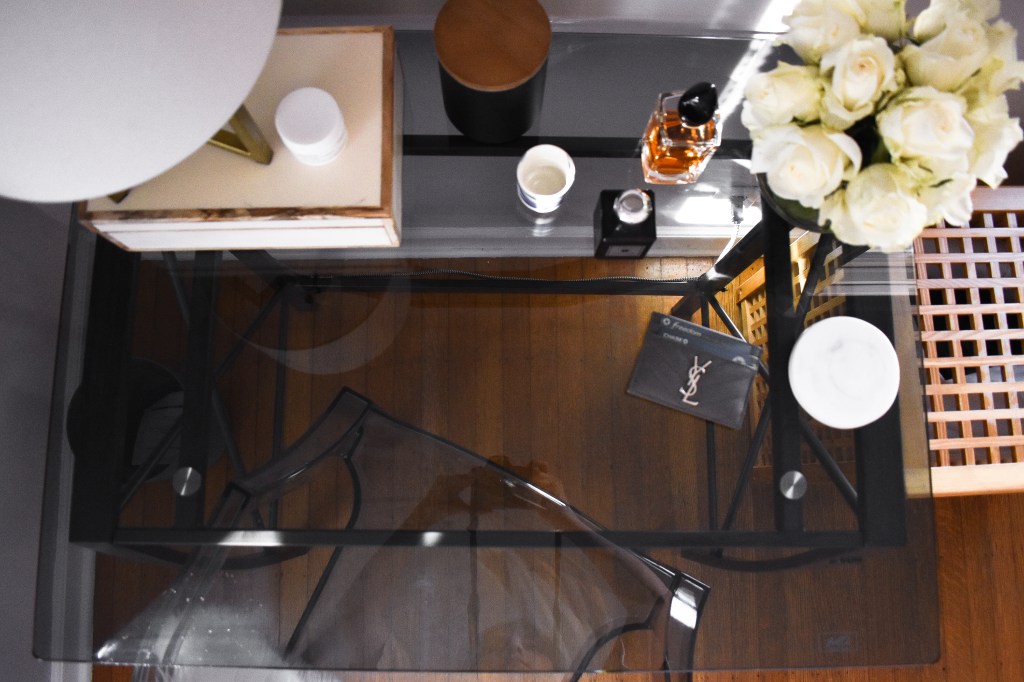 As far as my desk decor goes, the goal is form meets function. I was an idiot and bought a desk with no storage or drawer space, so I had to get creative with the decor items I chose. I stacked my lamp on a cute Studio McFee storage box from Target. I found a gorgeous burled wood option and marble option from West Elm. I use it to store all my skincare products because I do my skin and makeup routine at my desk. Anyone else? I also love that it declutters my desk rather than having all my products out on display.