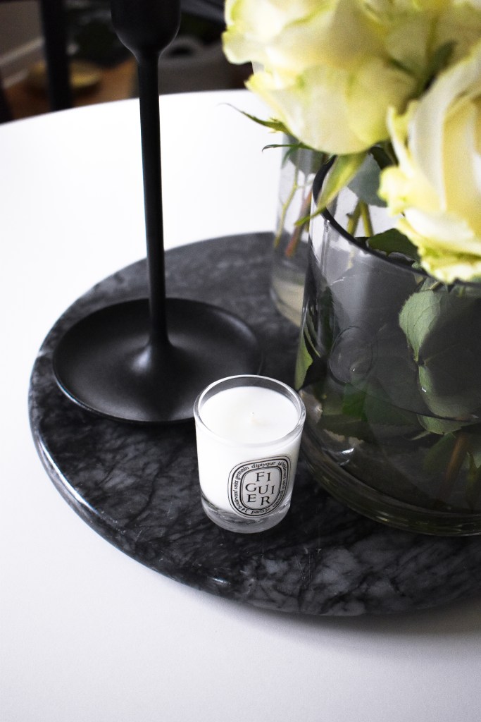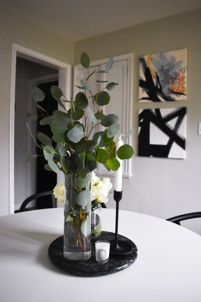 In my case, I have a circular tulip table from Ikea, so I chose a black marble, circular tray to ground my centerpiece. I think it does a great job making the space look cohesive because it mirrors the shape of the table. I do not have a link since it was passed down from my grandparents, but I found a very similar black marble tray under $30 at Crate & Barrel. I think my grandma used the marble tray to protect their countertops from hot pots and pans, but it really can be used for anything so get creative! I think it would be fun to utilize the stone tray as a charcuterie board when hosting guests or as a styling piece on your coffee table. Personally, I have used it as a mini cake stand as well. Point is…buy less, buy quality, and repurpose your items!
