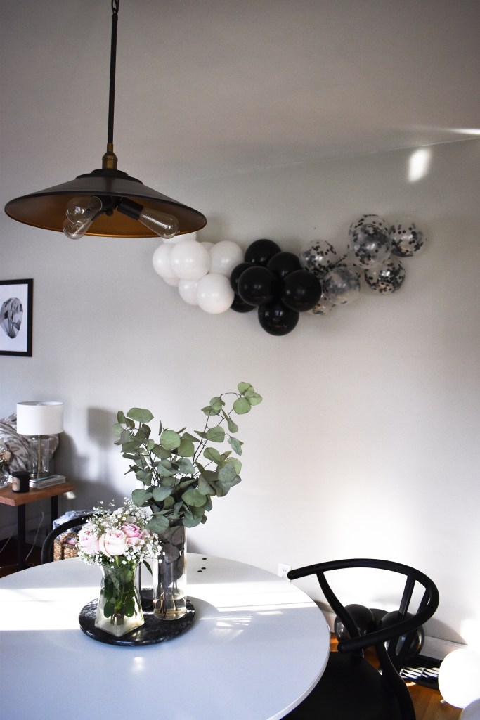 Of course, I opted for classic black and white balloons. I was going for a classy look, and these fit my vision perfectly. I found a 100-pack on Amazon for less than $15 which is more than enough since the garland only required 24 balloons. The variety pack also included clear balloons with black confetti which were my favorite.