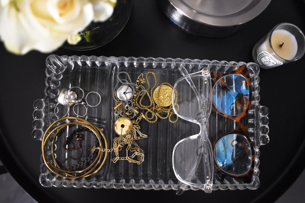 Arguably, everyone needs a tray on their bedside table to organize all their little essentials. I use mine for my most worn jewelry pieces and blue light glasses. I found my glass tray at Goodwill actually, which was the most pleasant surprise. I think I only paid $2.99 for it, which is one of the many perks to buying second-hand. I definitely suggest checking out your local Goodwill, but if you want to shop cute alternatives now, I found a mirrored tray with gold trim on Amazon for under $20. I also found a two pack mirrored tray option for under $20 with a pretty ridged side detail. That’s a great deal and it ships free with Amazon prime 😉 If you don’t like the mirrored look, I found a simple acrylic tray from Target for only $16. It’s very similar to the lucite tray I have in my living room from Homegoods. It’s elegant and will easily match anyone’s space. Check out my best decorative trays blog post for more of my favorites!