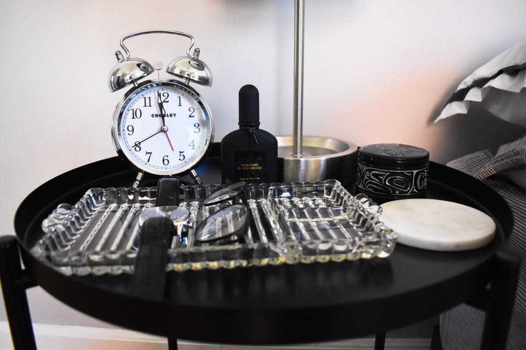 He has an identical table lamp and glass decorative tray. He has an alarm clock (that we never use – linked similar Amazon dupe), Tom Ford Black Orchid cologne (smells awesome by the way), a little black trinket jar, and a marble coaster (from Homegoods but linked similar Amazon option). The trinket jar is years old, but I found a cute black marble canister that could serve the same purpose. I also found a gorgeous handmade black lidded jar on Etsy. I love the organic shape and the idea of supporting a small business!