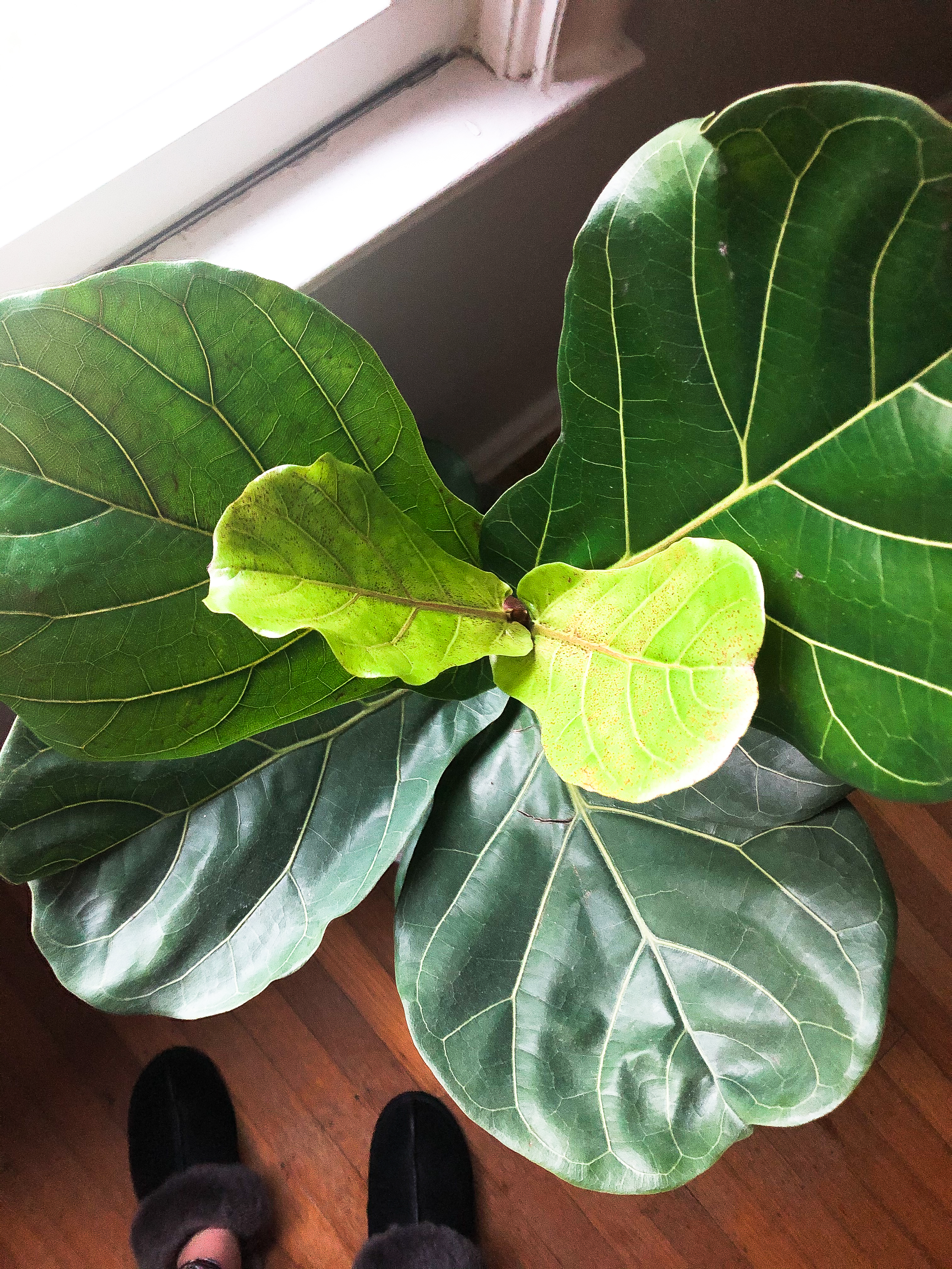(5) Joyful Dirt plant food. This is my secret weapon to keeping all my plants healthy. I sprinkle a little bit of Joyful Dirt (approximately 1tbsp) into my watering can before I water my fiddle leaf. I do this every other watering, so about twice a month. When I use it consistently, new leaves start sprouting up (see below)! If your plant is struggling, I would use this every single watering until it’s healthy again.