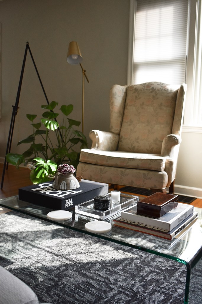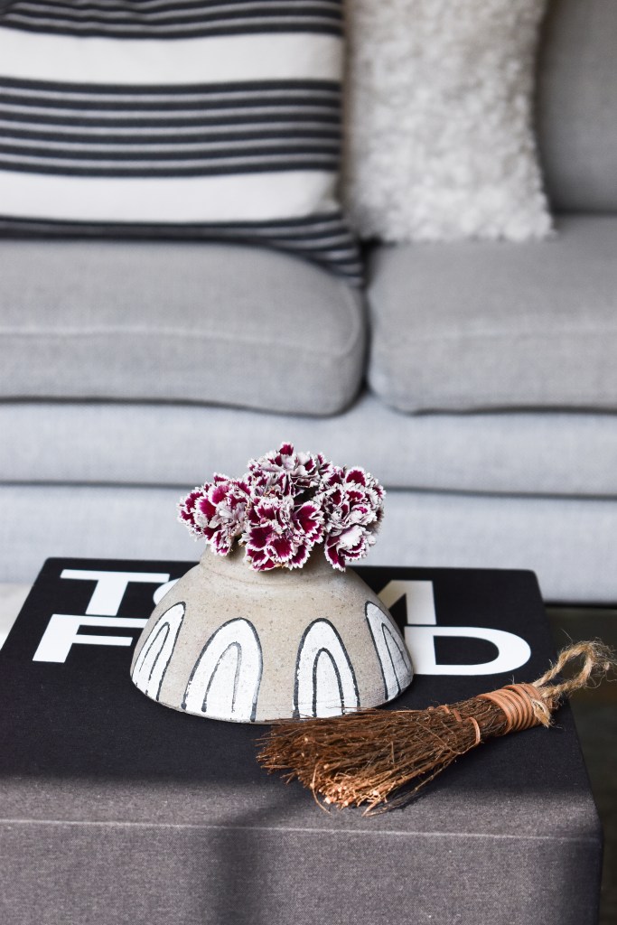 I kept the fall decor minimal on my coffee table. I used the same burgundy Trader Joe’s flowers in a taupe ceramic vessel, a vintage tortoise shell decorative box, and a mini cinnamon broom from Trader Joe’s.