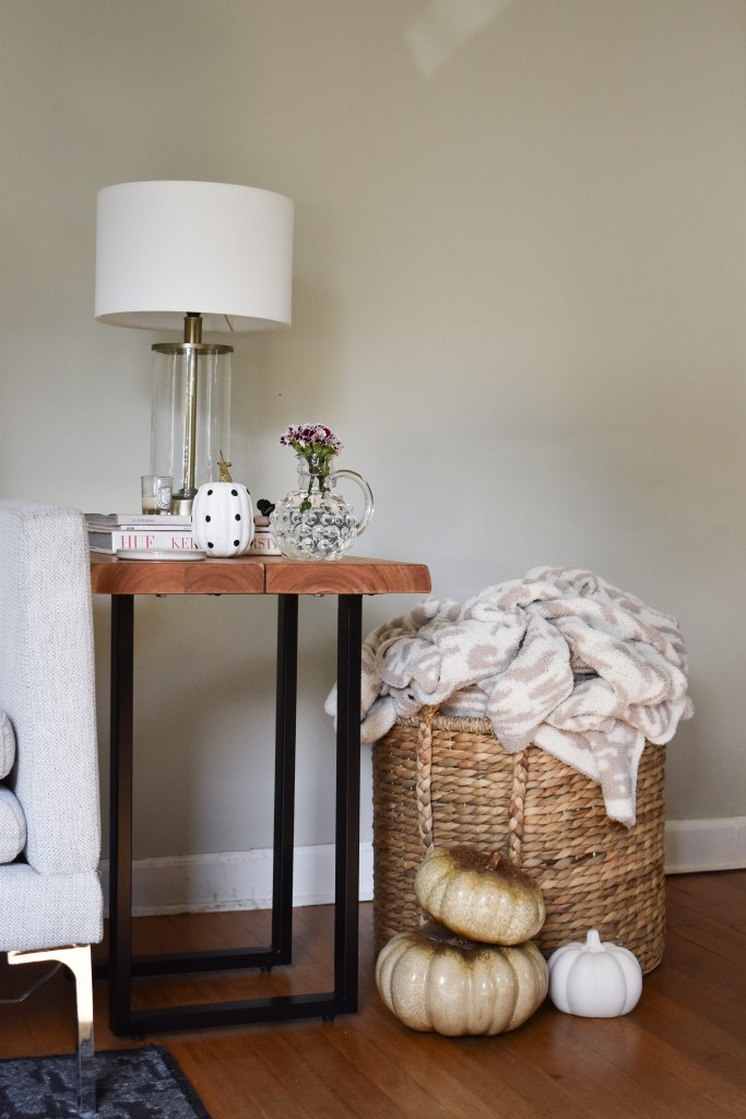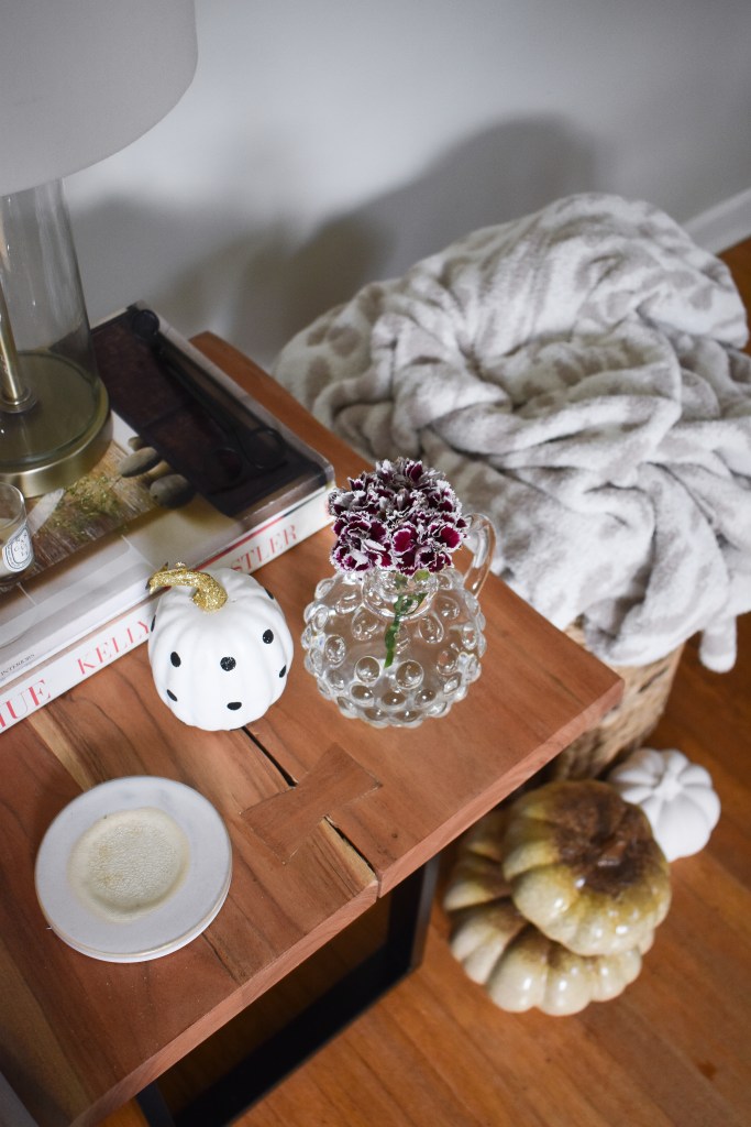 I decorated my living room side table with a burgundy flower arrangement and decorative pumpkins. I bought the flowers from Trader Joe’s, and the pumpkins are several years old. Crate & Barrel has some gorgeous white ceramic pumpkins, and Amazon has great affordable pumpkin sets as well.