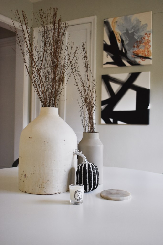 For my dining room tablescape, I layered a couple decorative vessels with scented branches. Both the gray Studio McGee vase and the large distressed ceramic vase are affordable Target finds. I love the creamy white and taupey gray colors for fall, but they are versatile enough to be used year round as well. The scented branches are from the cinnamon broom at Trader Joe’s. They sell it at the entrance of the store, and it smells heavenly. It smells exactly like Big Red gum but better.