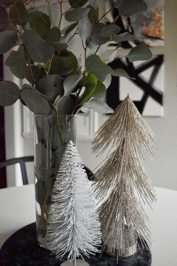 I found these glitter trees at Target. The white gold pictured on the right was only $5. The silver on the left was only $3 in the dollar section. Both are so cute and very affordable. Fair warning, they definitely shed, but I don’t mind because they just sit there. This season I got these adorable glitter bottle brush decorative trees. They come in a two pack for only $5.