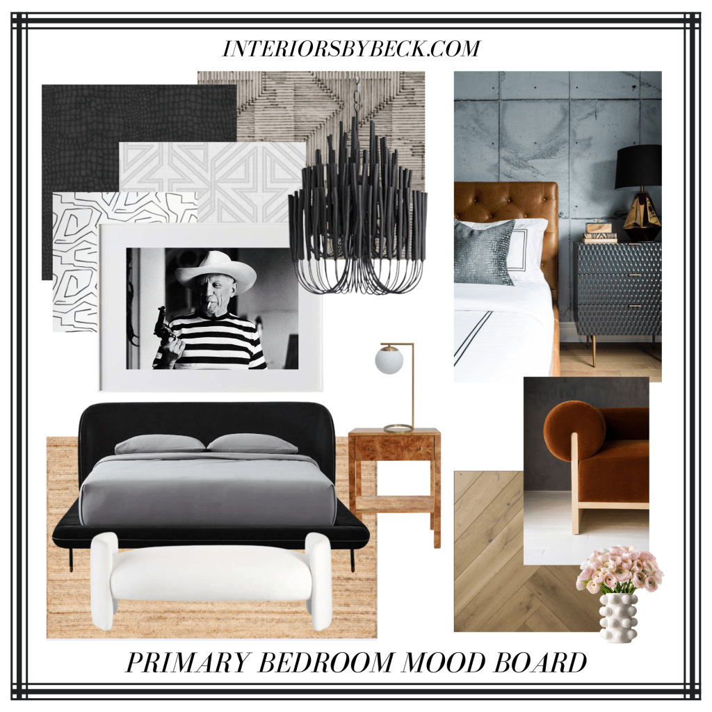 My inspiration photo (pictured in top right-hand corner) helped guide some of my design choices as well. It is the primary bedroom of Jennifer Cavorsi Design’s Modern Boston Condo project. I discovered her design years ago while scrolling the depths of Pinterest, and I haven’t stopped thinking about it since.